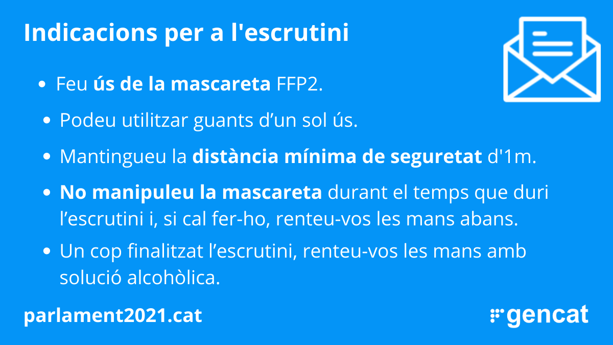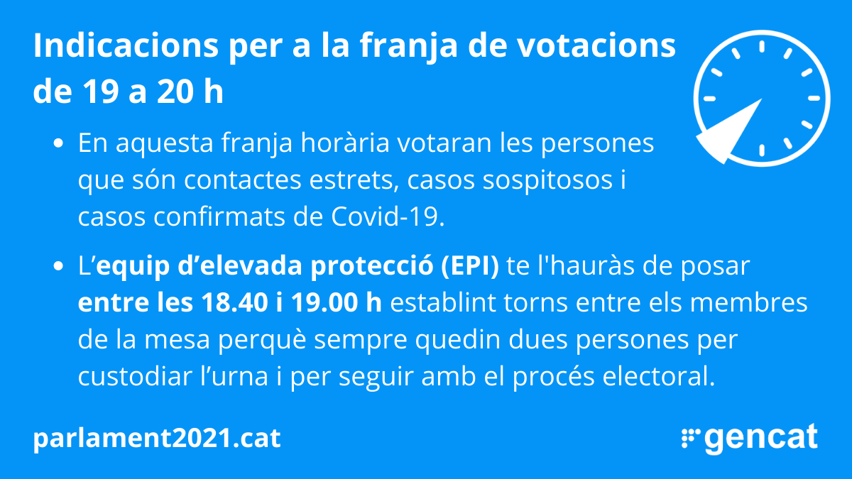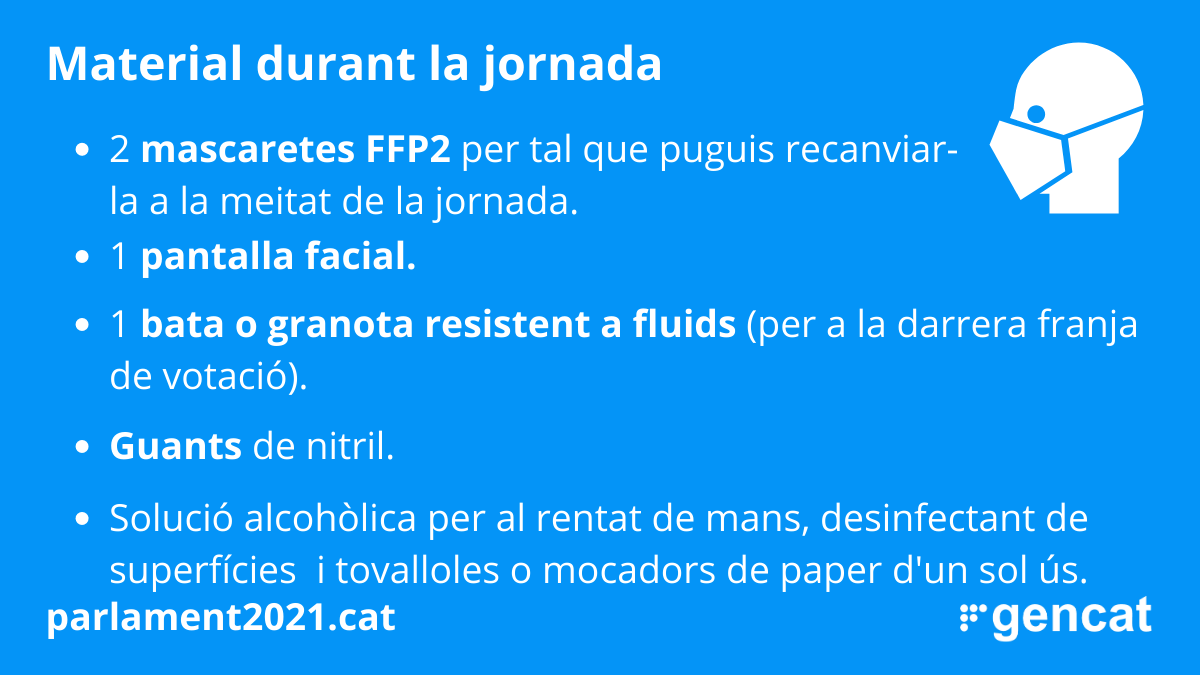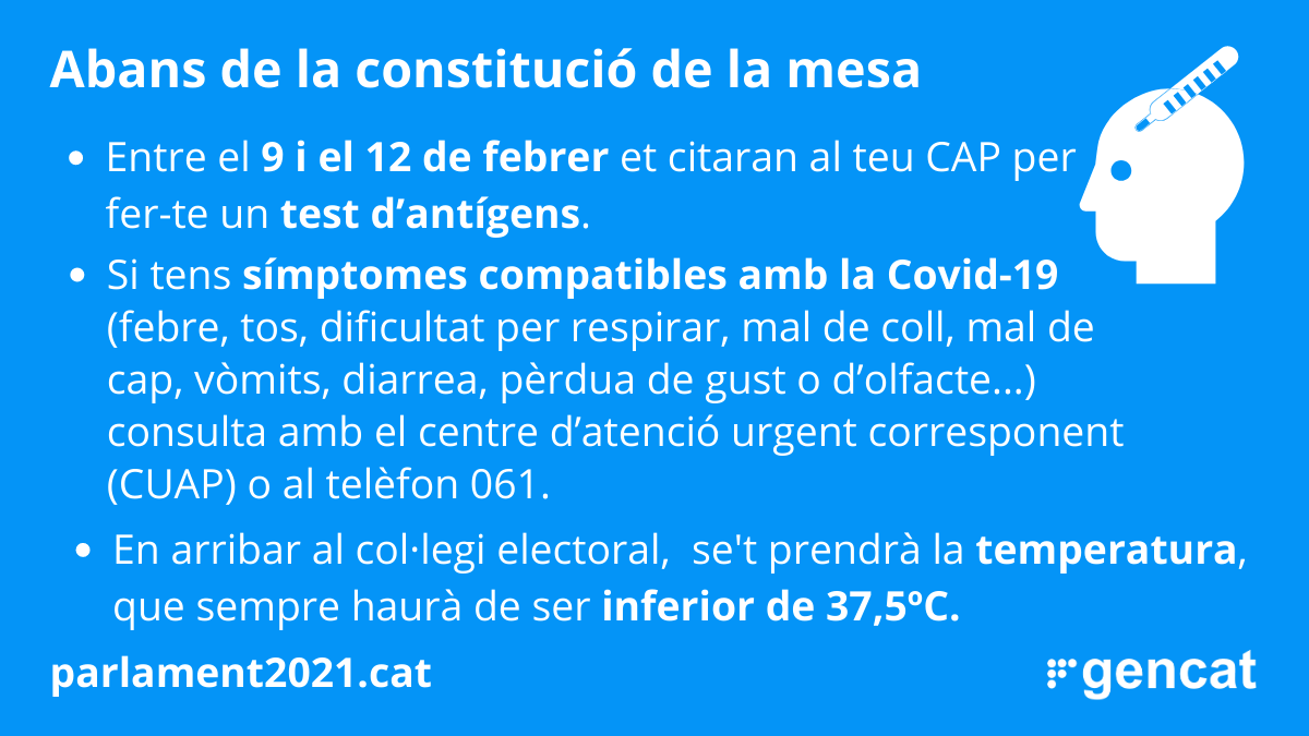 Opcionalment i de forma voluntària, entre el 9 i el 12 de febrer, els membres titulars de la mesa i els primers suplements podeu fer-vos una prova diagnòstica de COVID-19. No obstant això, si sou segon suplent i us acrediteu degudament, també podeu fer-vos la prova.