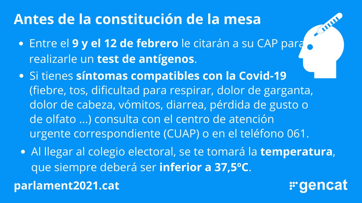 Opcionalmente y de forma voluntaria, entre el 9 y el 12 de febrero , los miembros titulares de la mesa y los primeros suplementos puede hacerse una prueba diagnóstica de Covid-19. Sin embargo, si es segundo suplente y se acredita debidamente, puede hacerse la prueba.