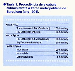En essència, l’any 1994, 200 hm3 van procedir del riu Ter, 106 del Llobregat i 193 d’aqüífers diversos. De vegades es diu que això representa una infrautilització de les aigües subterrànies (dels països europeus, només Noruega fa servir una proporció d’aigües subterrànies més petita). Cal dir, però, que tampoc tenim gaires aqüífers grans. En tot cas, sobre aquest tema hi tornarem més endavant.